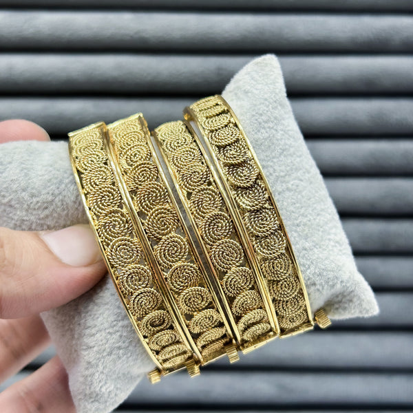 This luxurious 4pc bangle set is crafted in copper with a unique coiled, spiral texture throughout the bands. The slim profile of these four individual pieces allows them to be stacked for a traditional, high-fashion statement.