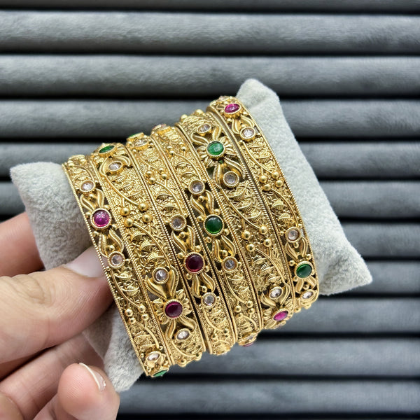 A celebratory 6pc bangle set showcasing a vibrant blend of multi-colored glass stones and Polki accents woven into a detailed, antique-finished vine pattern.