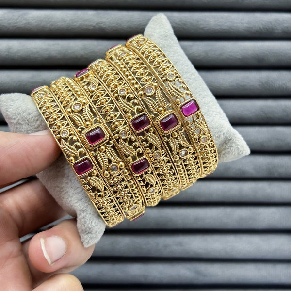 A striking 6pc bangle set designed with a repeating teardrop and rectangular motif, featuring vibrant ruby-red glass stones and fine gold beadwork for maximum opulence.