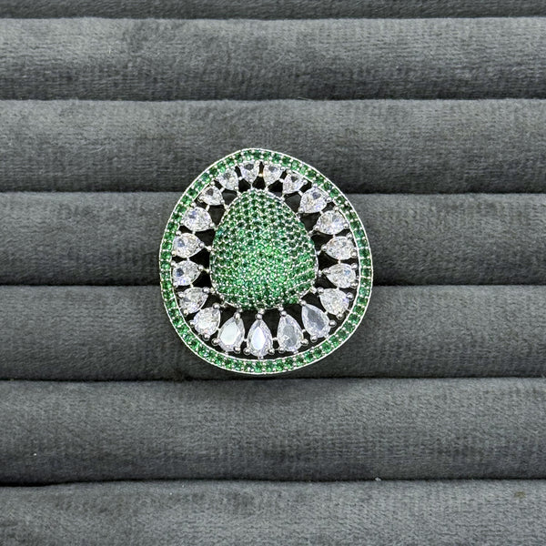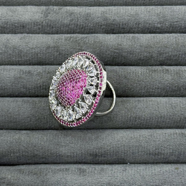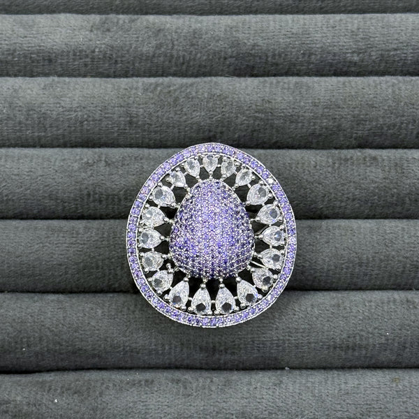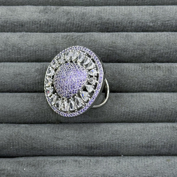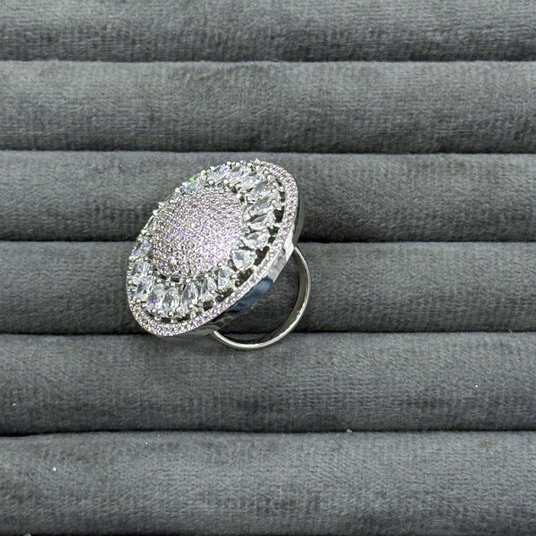 These striking, oversized rings feature a central, raised dome paved entirely with colored Zircon stones, framed by an intricate border of white Zircon set in a high-shine silver rhodium polish.