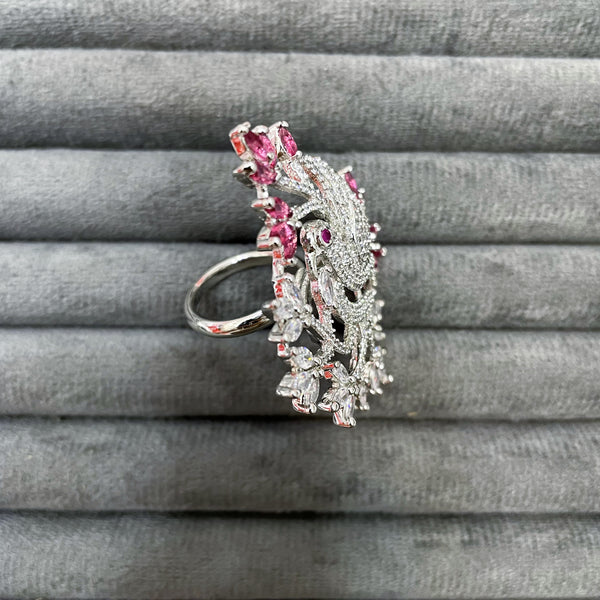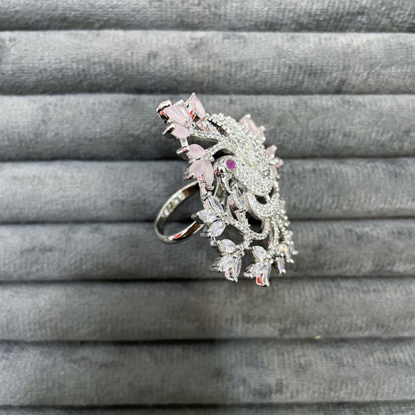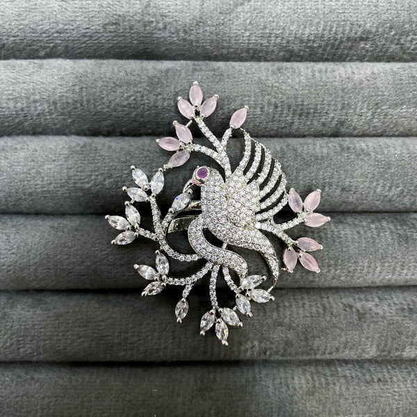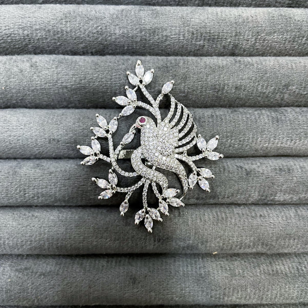 These magnificent figurative rings feature a beautifully sculpted peacock or bird motif, fully paved with brilliant white Zircon stones, set amidst stylized branches of marquise-cut white and colored Zircon stones, with the setting expertly finished in a durable silver rhodium polish.
