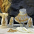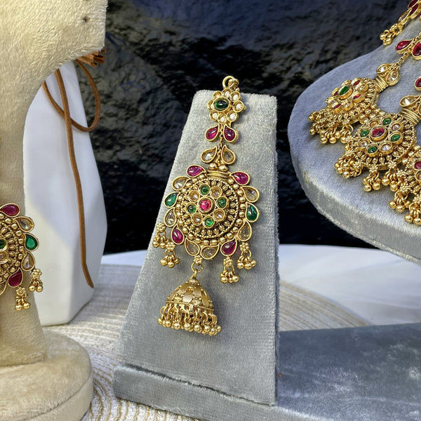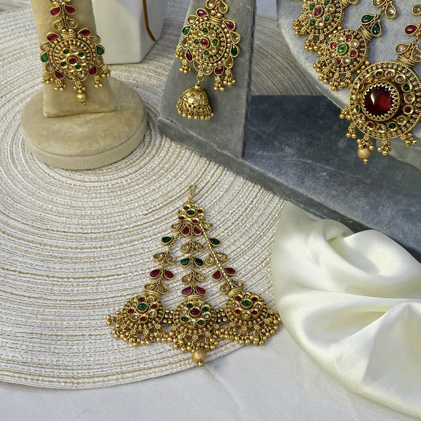 Multi-tonal palette of emerald-green and ruby-red glass stones. Emphasizes Polki artistry in a unique, matte golden finish luxury set.