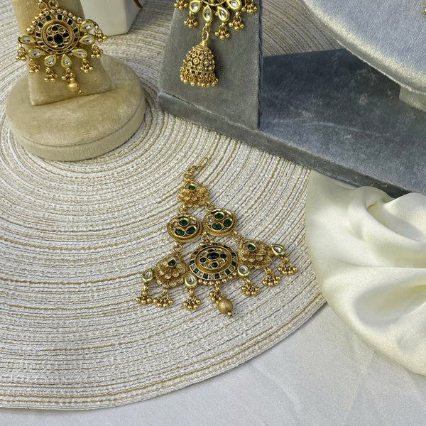 Heavy choker with vibrant emerald-green glass stones and a matte golden finish. Detailed floral motifs and teardrop Polki accents create a grand statement.
