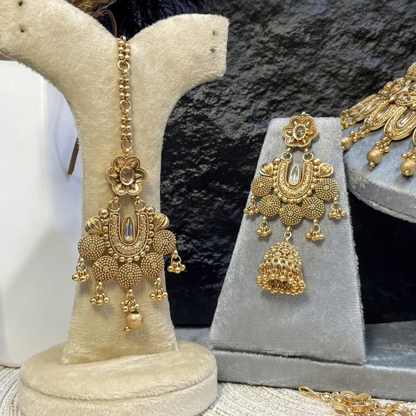 Broad, textured matte golden finish choker with petal motifs and clear glass stone centers. Completed with traditional jhumkas and a matching maang tikka.
