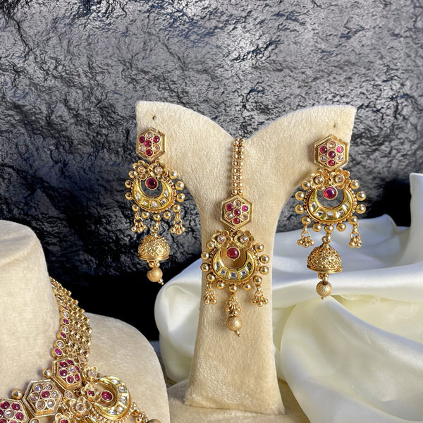This premium variation of the Mehraab design features enhanced filigree detailing and high-quality mixed stones. The necklace provides a heavy heritage appearance while remaining durable and comfortable. Perfect for brides and grand festive celebrations.