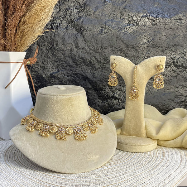 A variant of the Mehraab design, this set features refined antique gold link detailing and vibrant Kundan accents. The central pendant holds a shimmering glass Polki, surrounded by floral filigree. Complete with matching tiered earrings for a complete festive look.