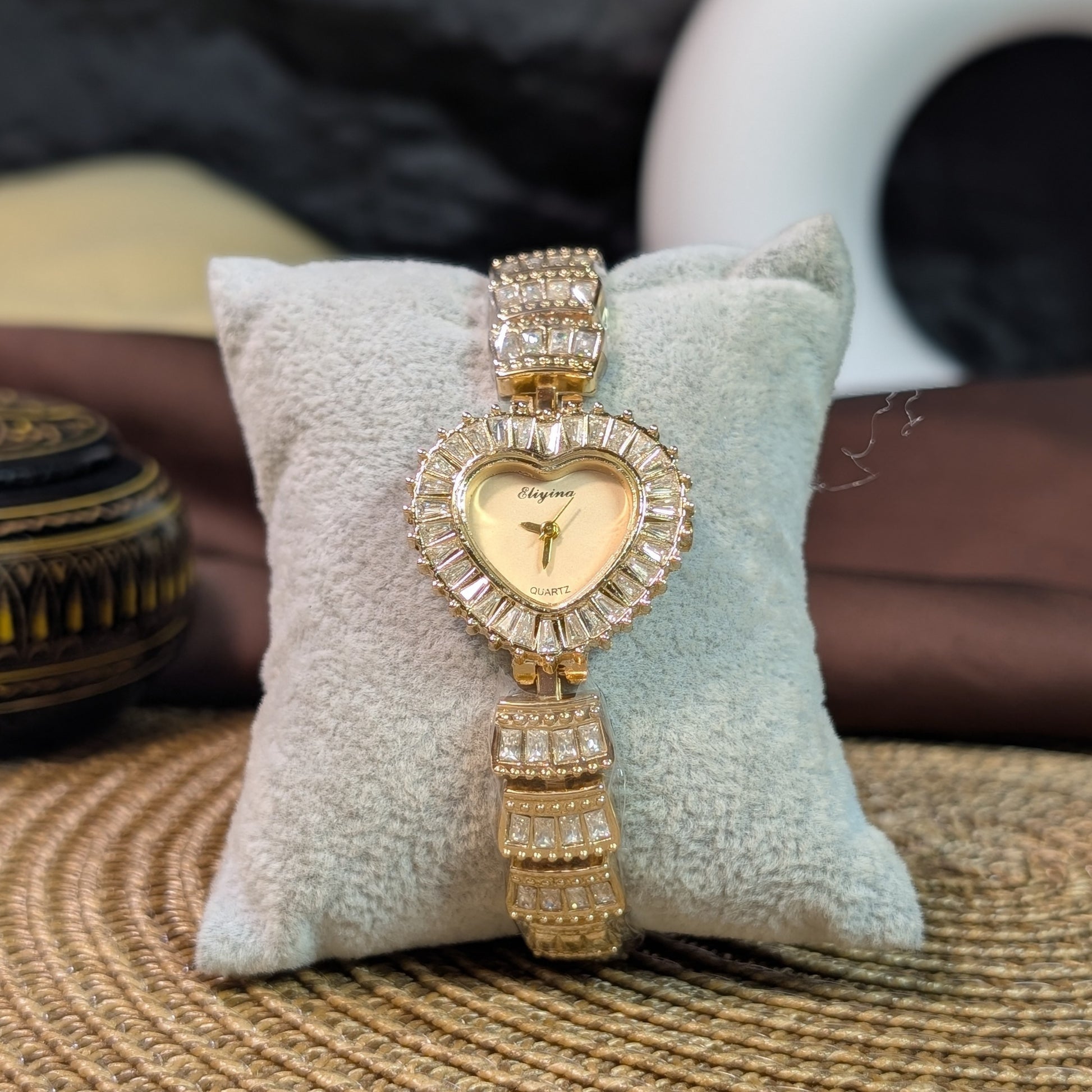 This romantic stainless steel watch features a heart-shaped case framed by tapered baguette crystals and a regal, stone-encrusted bracelet.
