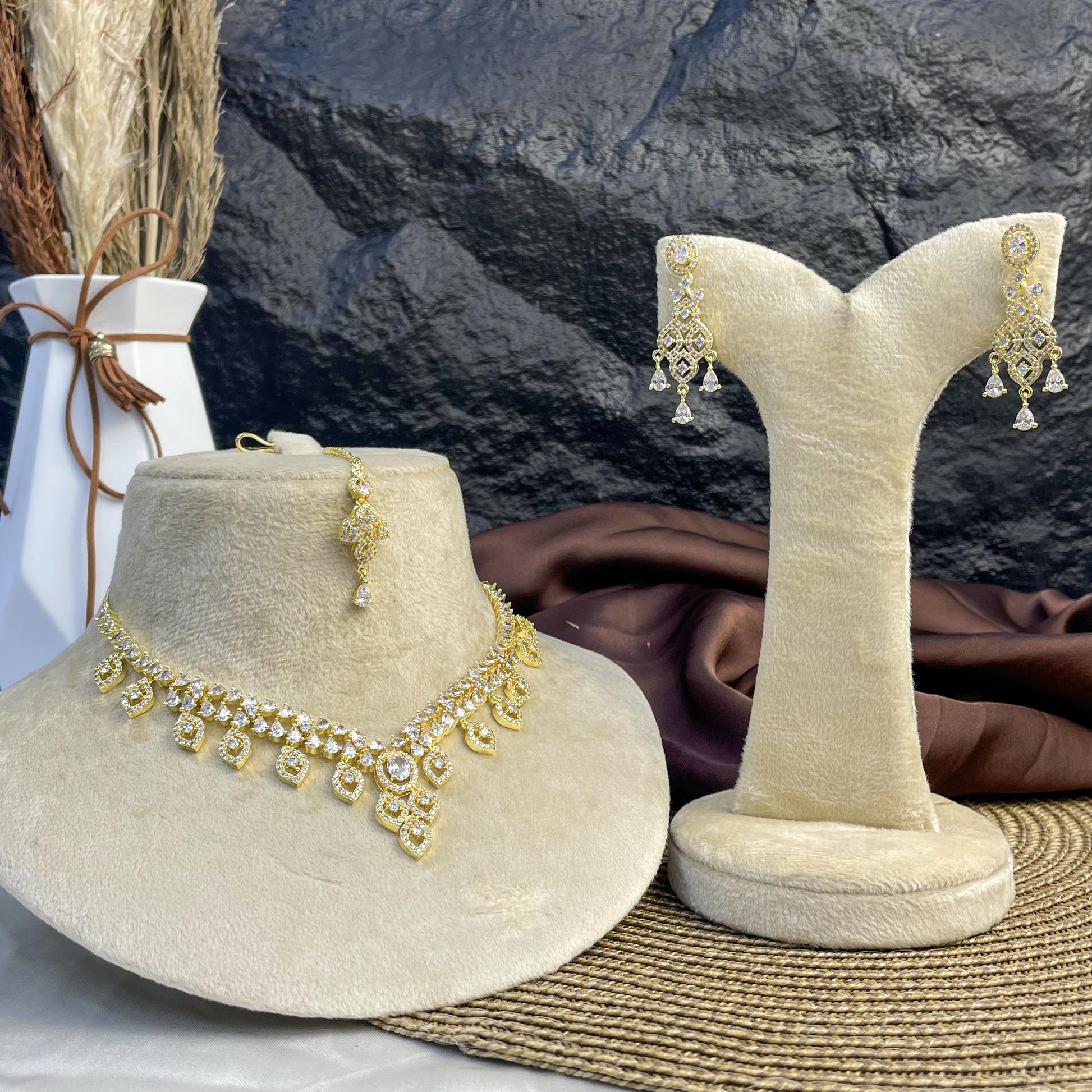 An intricate gold-plated V-shaped design featuring a shower of dangling marquise and teardrop zircons in Mint, Rose, and Clear.