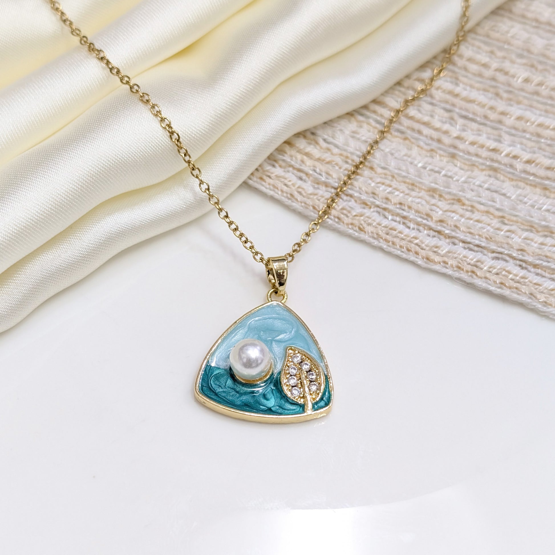 A modern triangular stainless-steel locket featuring a layered teal and blue enamel landscape, accented by a central pearl and a crystal-encrusted leaf.