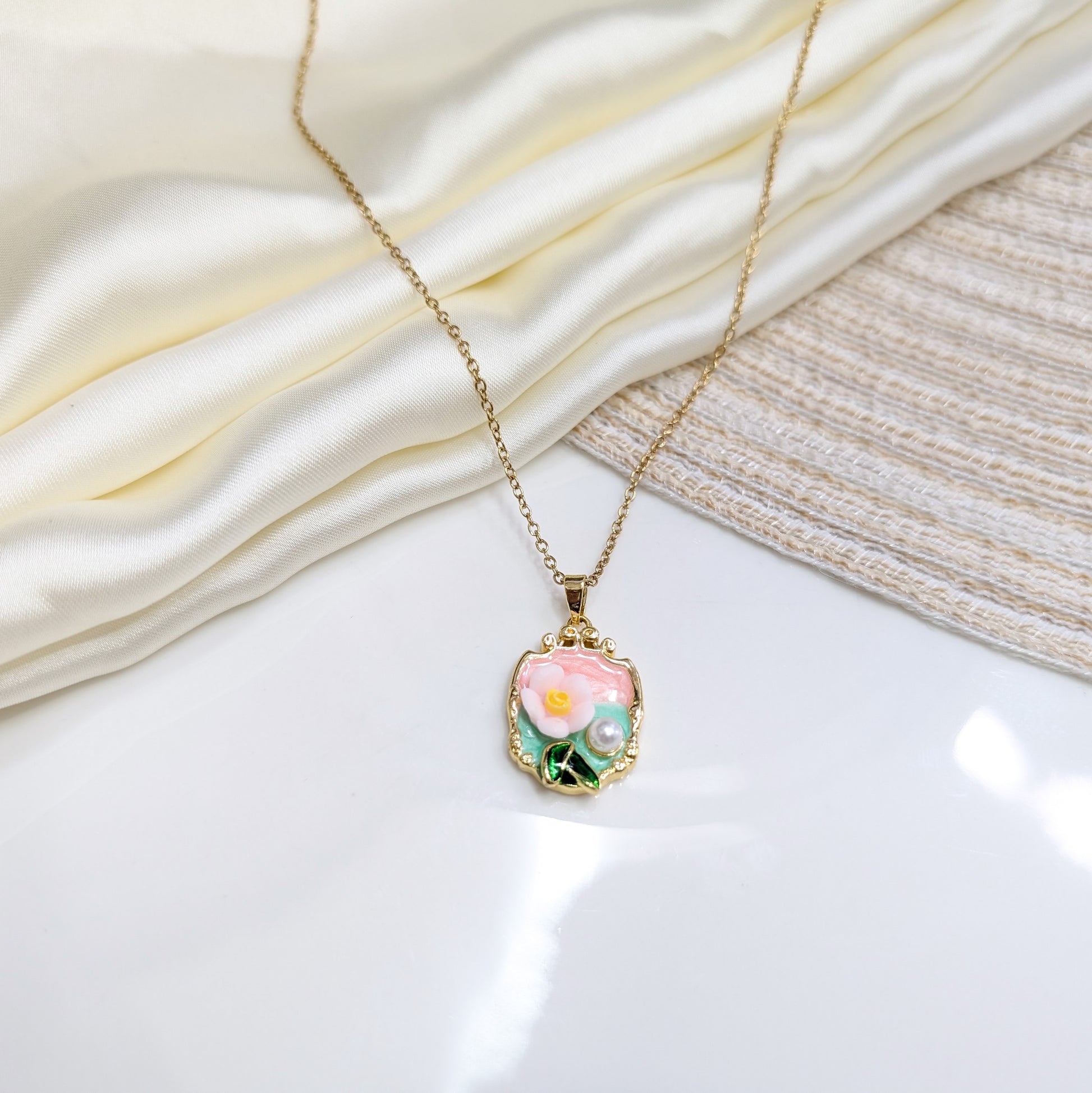 A charming organic-shaped pendant featuring a soft blush-pink peony and a luminous pearl, creating a romantic and colorful statement piece.