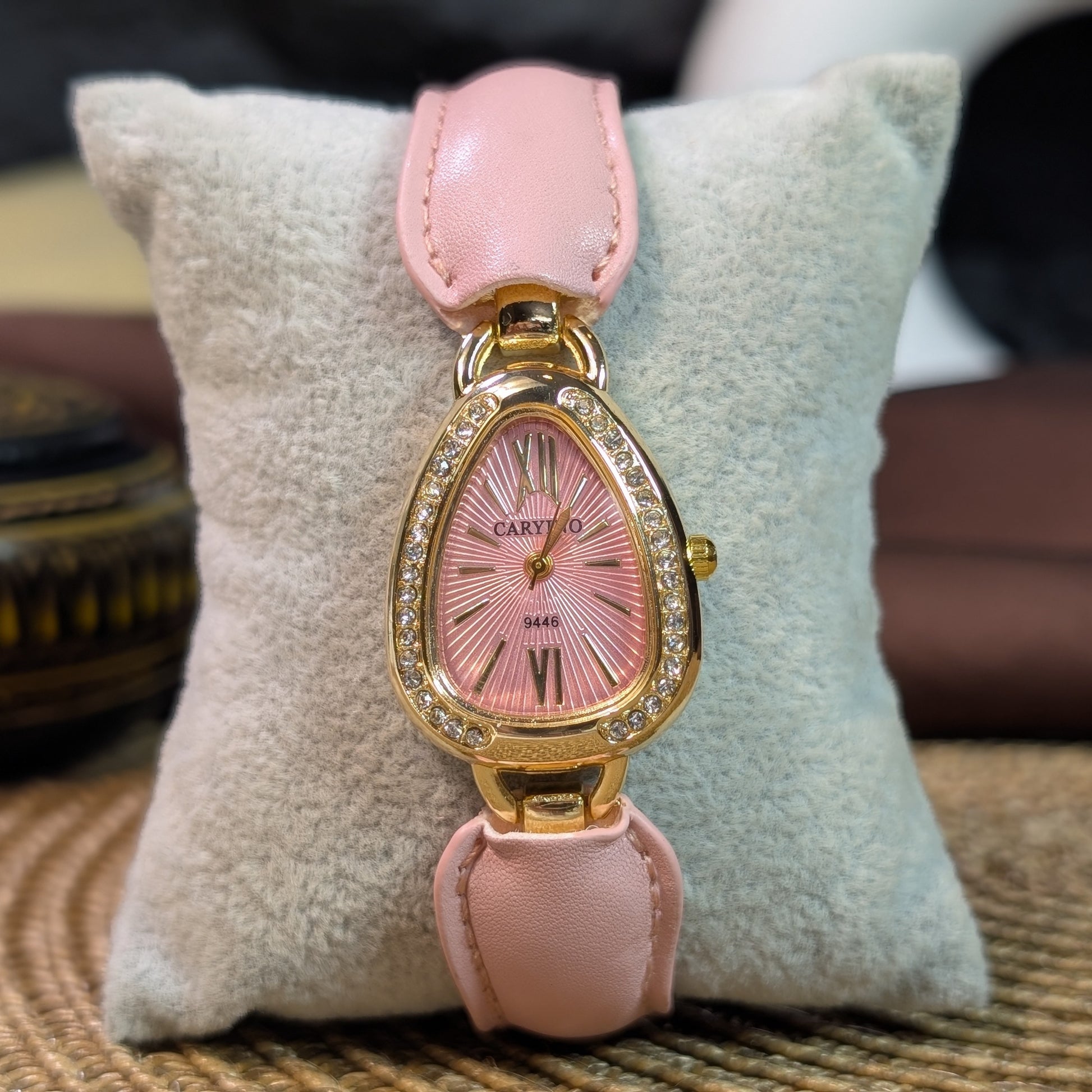 An elegant stainless steel watch with a teardrop-shaped gold case and a sunburst pink dial, finished with a feminine soft-pink leather-style strap.