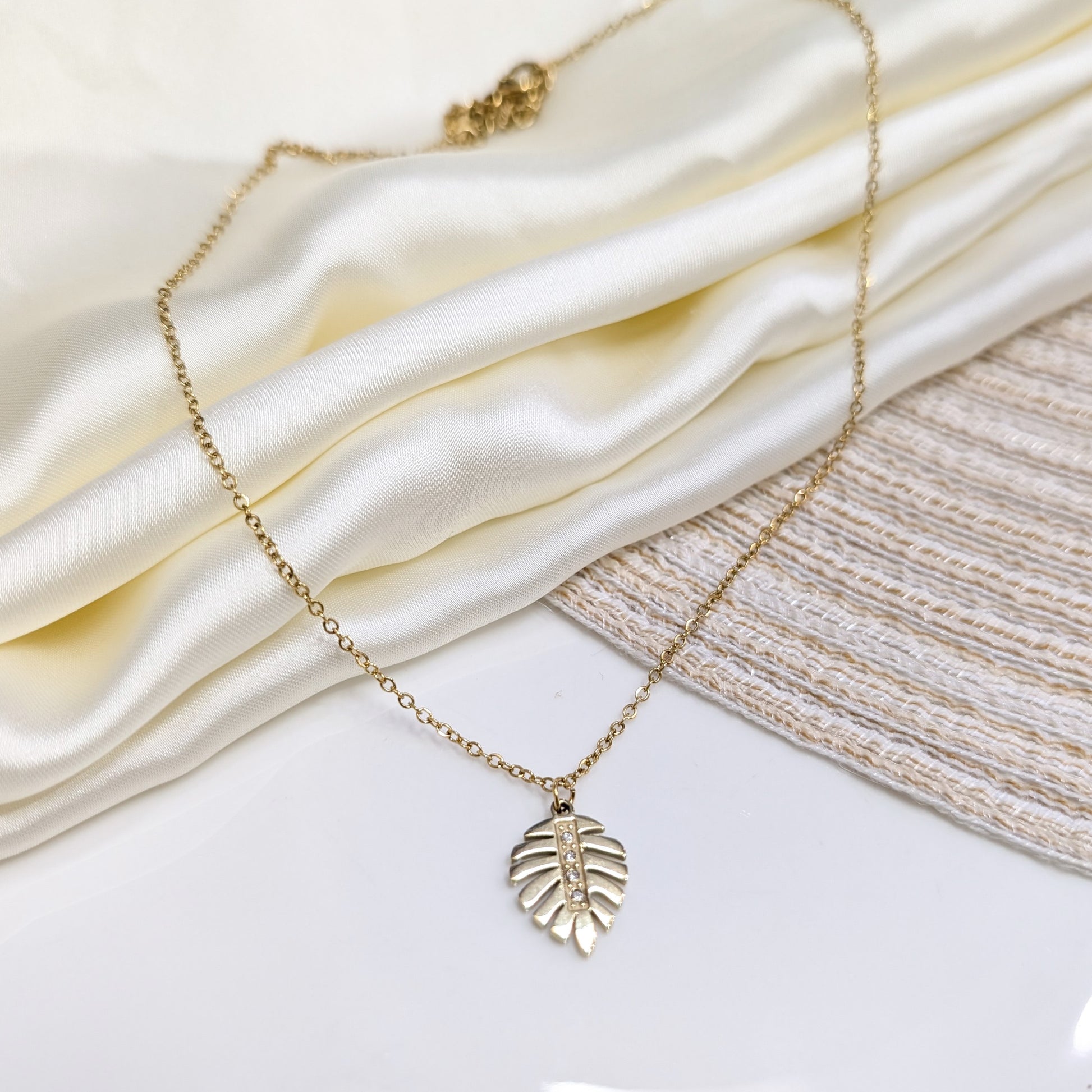 A tropical-inspired gold-toned necklace featuring a detailed Monstera leaf pendant accented with a central column of shimmering micro-crystals.