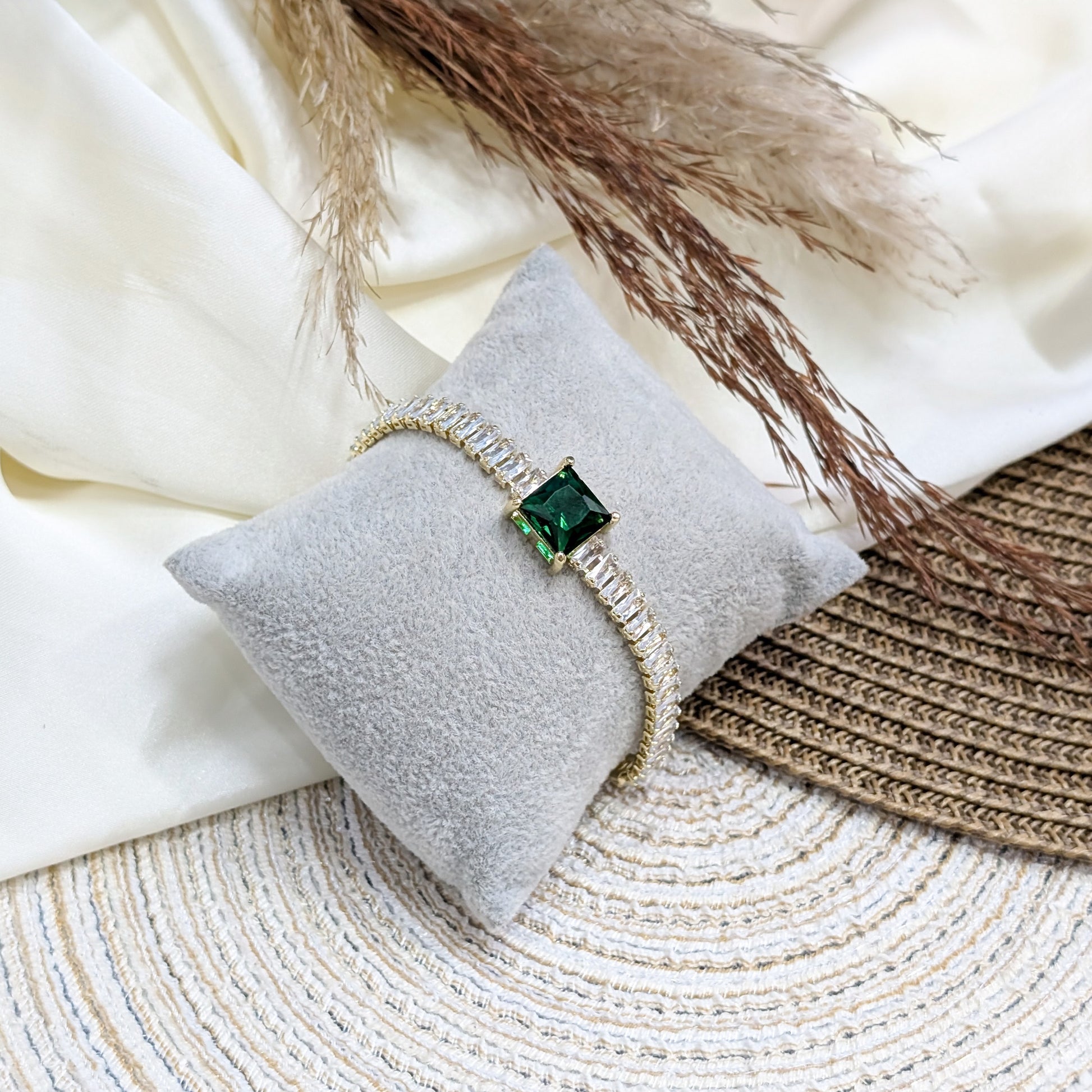 The stainless steel bangle bracelet featuring a central square green gem surrounded by rectangular clear stones.