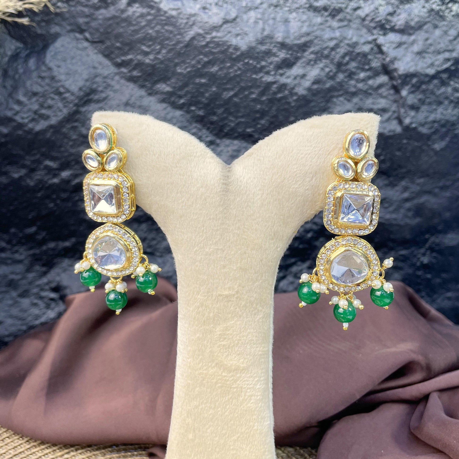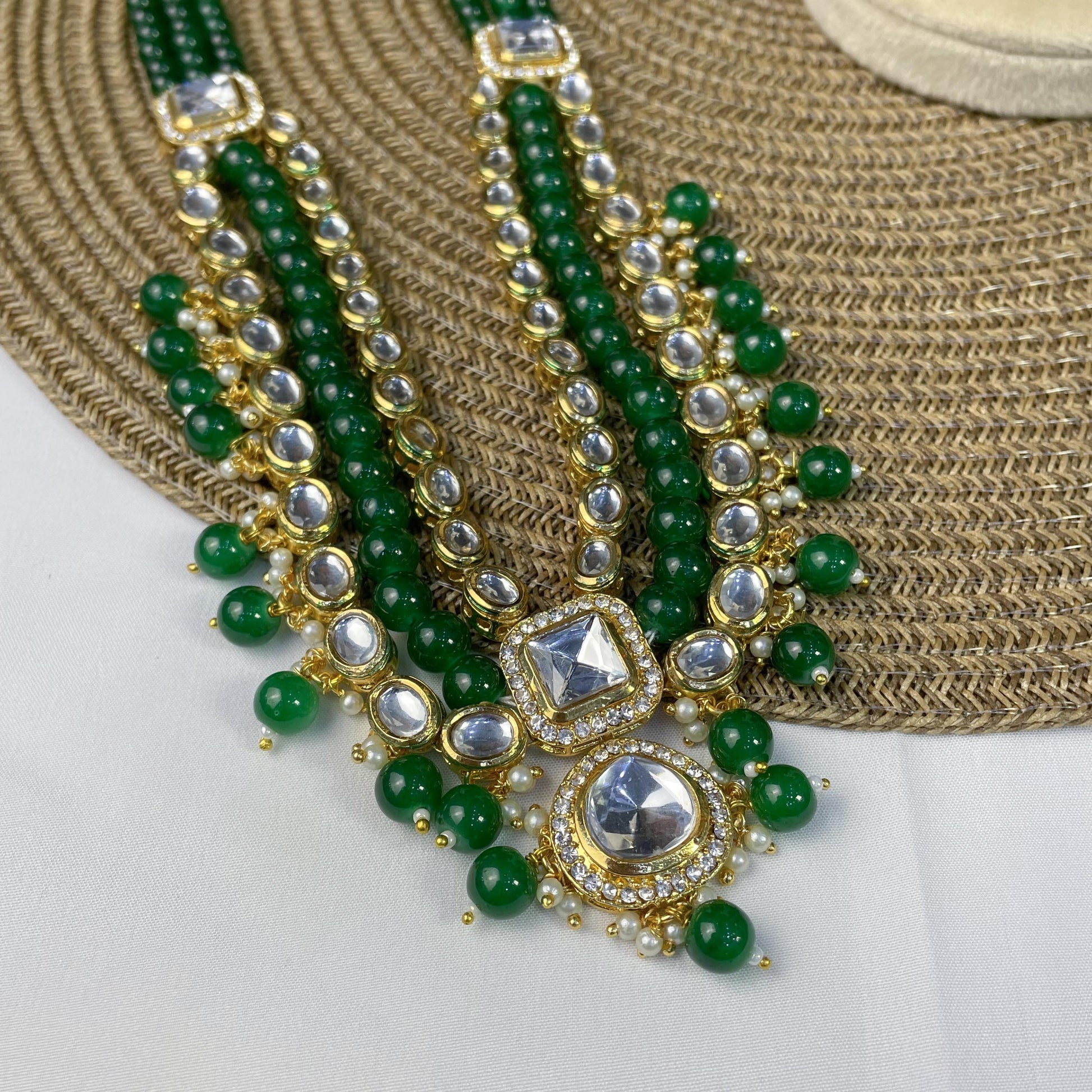 Bold and majestic, this set features square Kundan blocks integrated into vibrant green bead strands. The heavy-weight appearance remains comfortable to wear, making it a perfect pick for wedding guests.