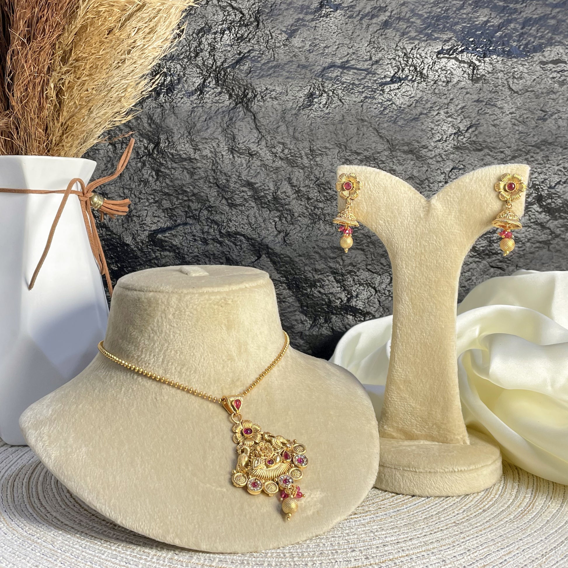A sophisticated statement piece accented with rich ruby-red glass stones that complement the textured gold patterns and Polki detailing.