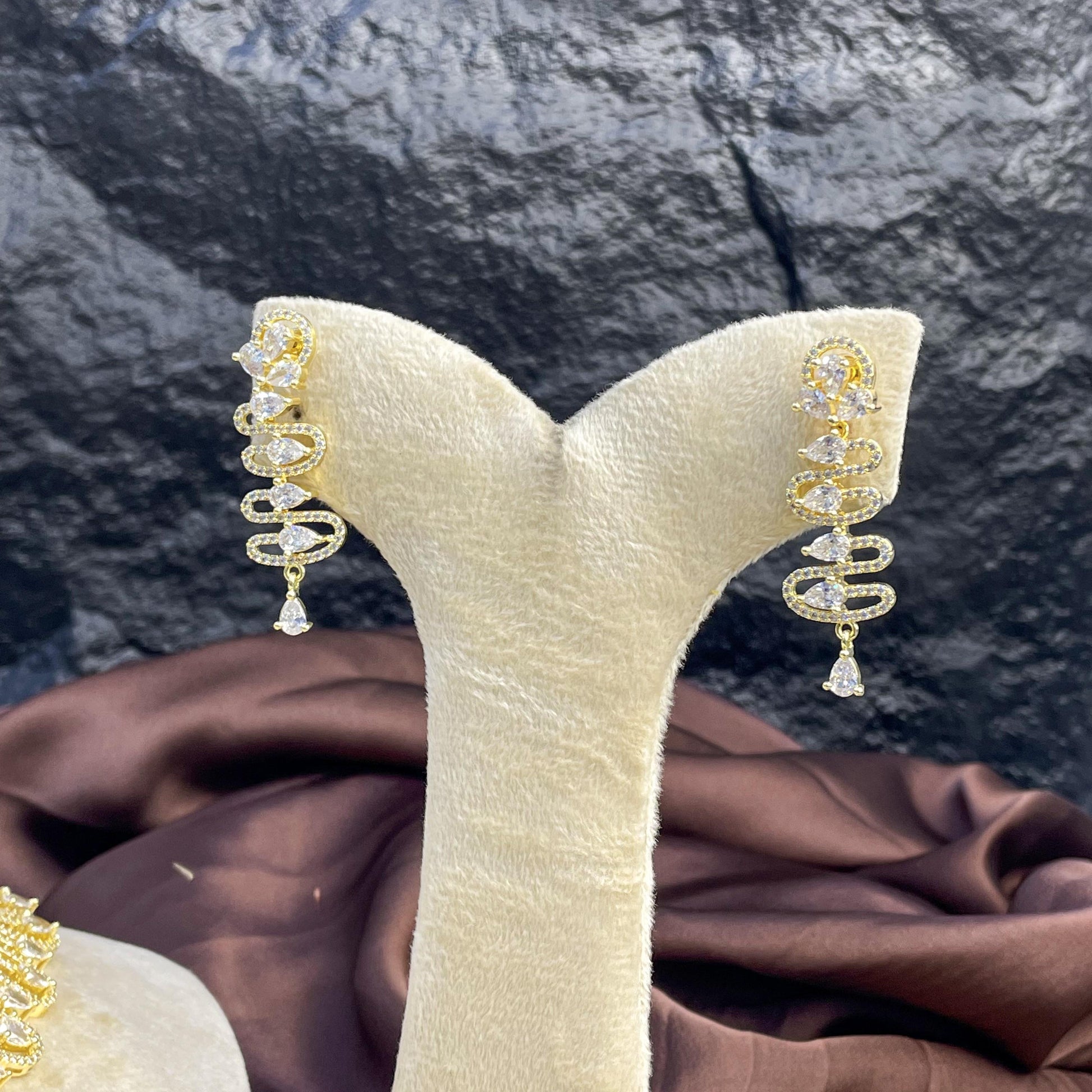 Features structured, interlocking gold-plated crest links framing vibrant pear-cut centerpieces in Mint, Rose, and Diamond White.