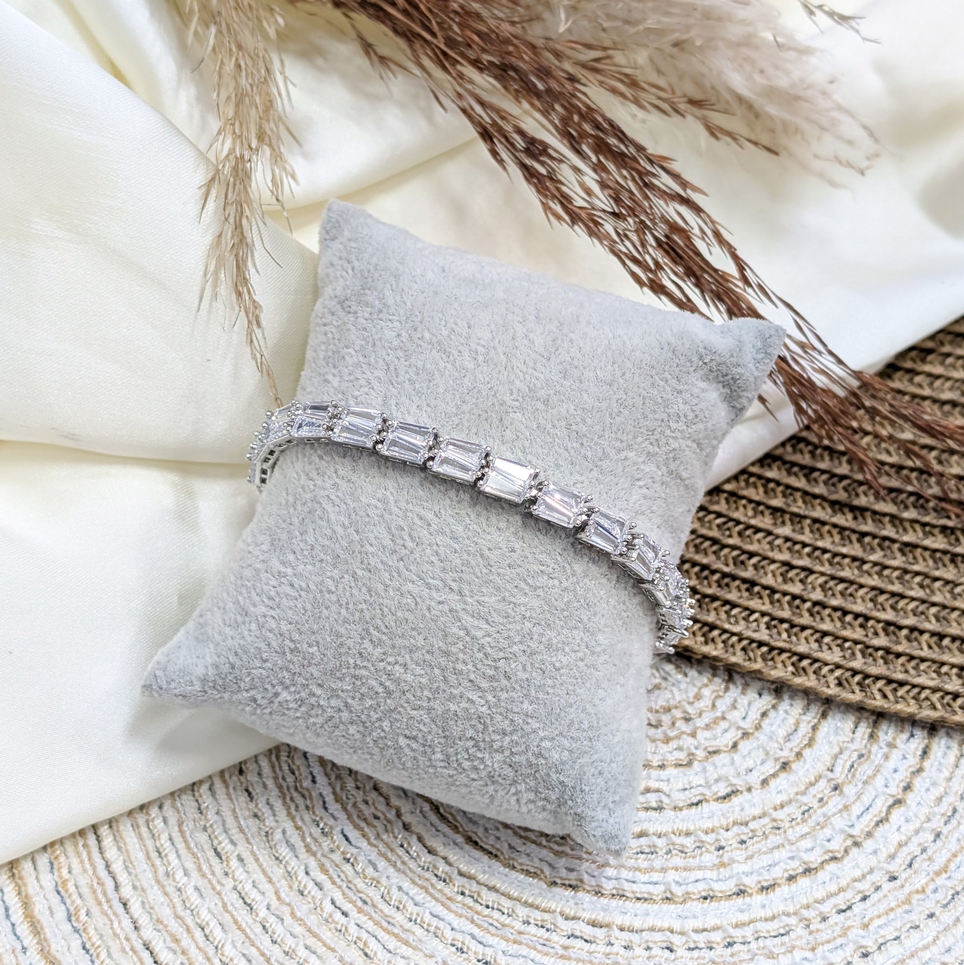 Silver-toned bracelet with a row of brilliant-cut zircon baguettes.