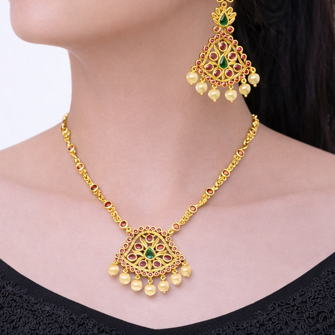 Featuring an elongated, chandelier-style design, this set combines emerald green and ruby red glass stones within an intricate gold-tone framework, perfect for adding a touch of grandeur to traditional ensembles.