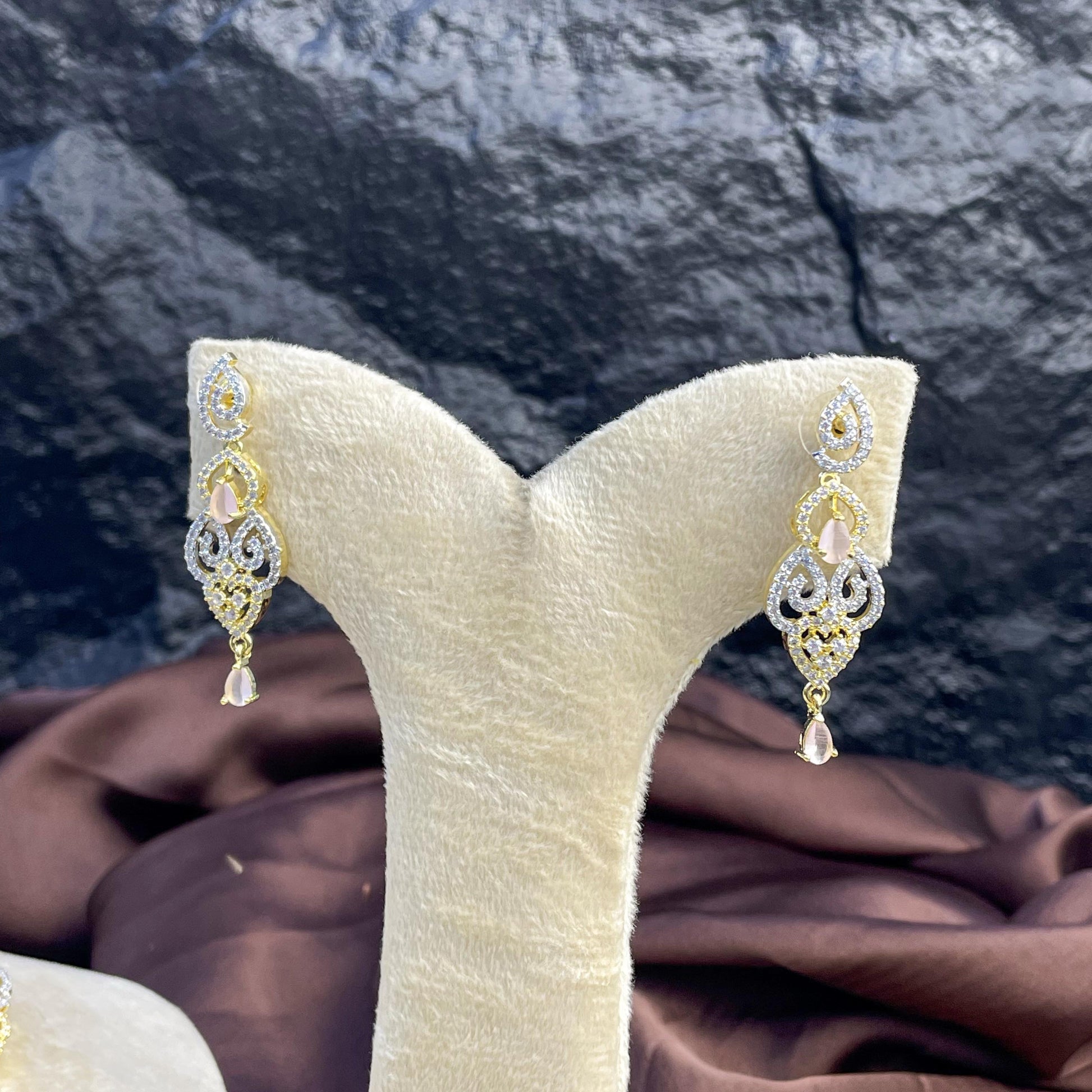 A gold-plated continuous leaf-inspired pattern crowned with marquise and pear-cut zircon accents in Mint, Rose, and Champagne.