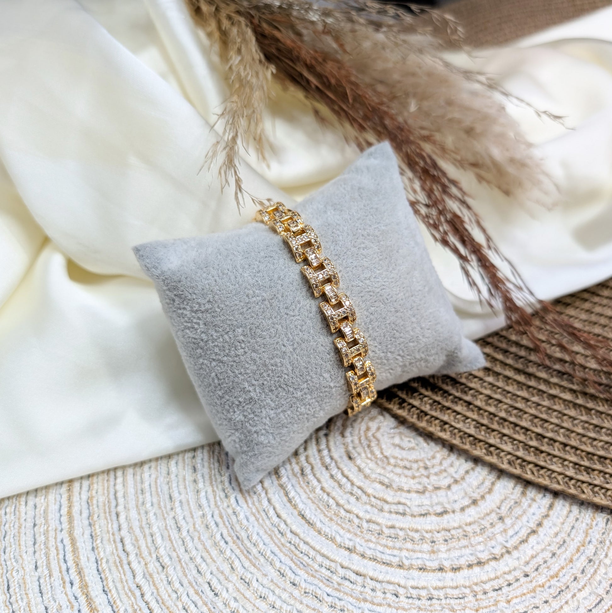 Gold-toned "H" links filled with white zircon baguettes.