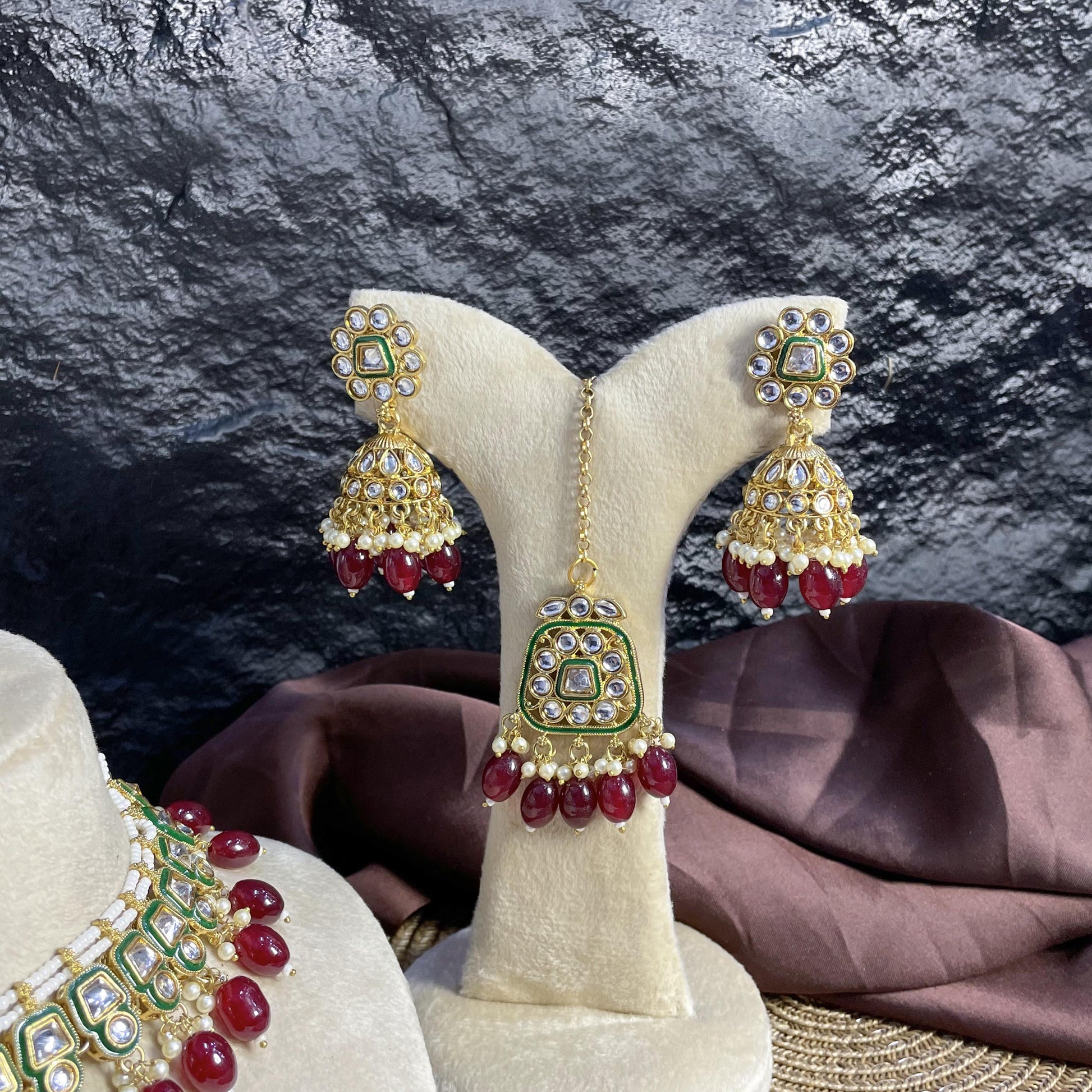 A regal multi-strand pearl choker supporting a high-shine Kundan medallion, detailed with glass-colored beads for a classic heritage finish.