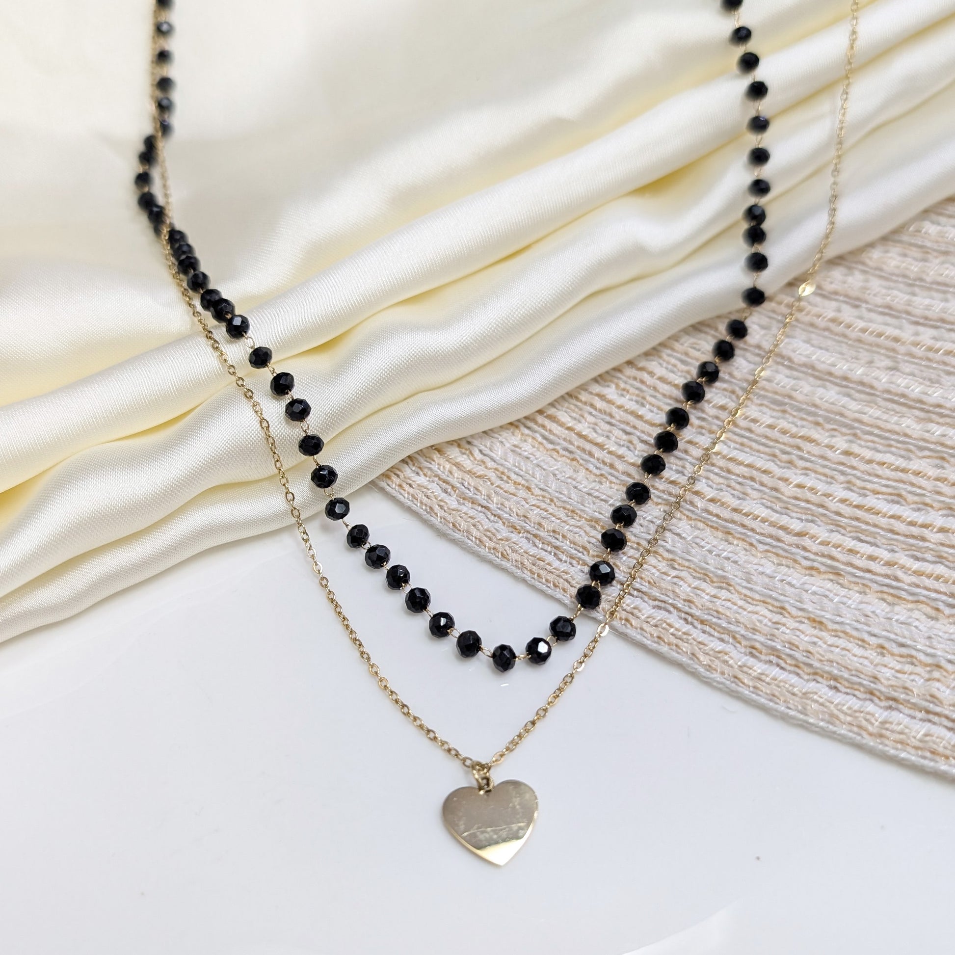 A charming double-layered gold-toned piece featuring a strand of faceted black onyx beads and a polished heart pendant for a romantic contrast.