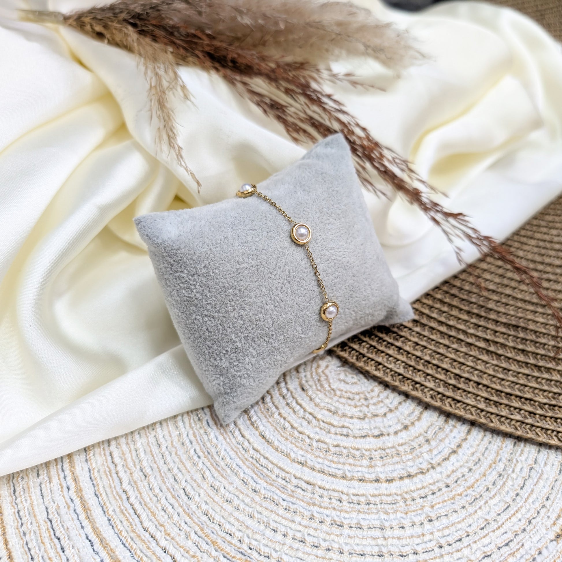 A stainless steel bracelet with a thin gold chain and small pearls held in place by gold rings.