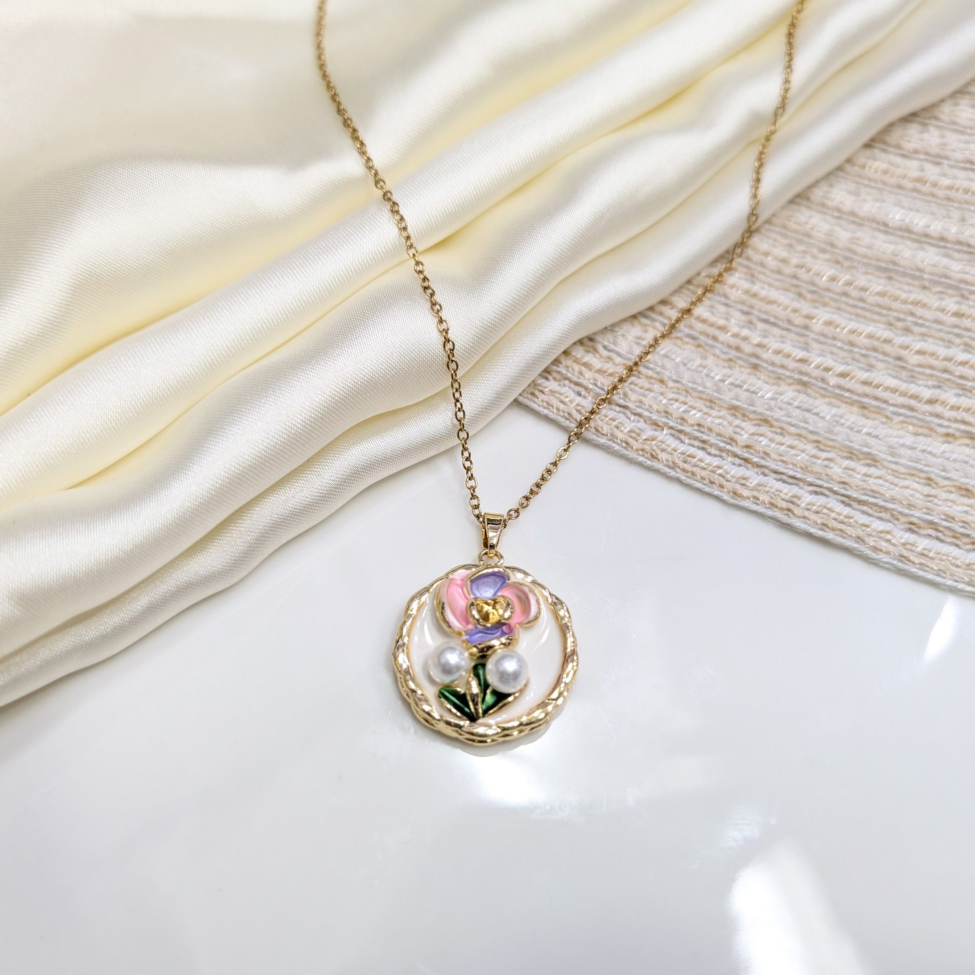 A classic gold-toned circular locket featuring a lush pink and purple enamel peony with twin pearl accents, set against a clean white background.