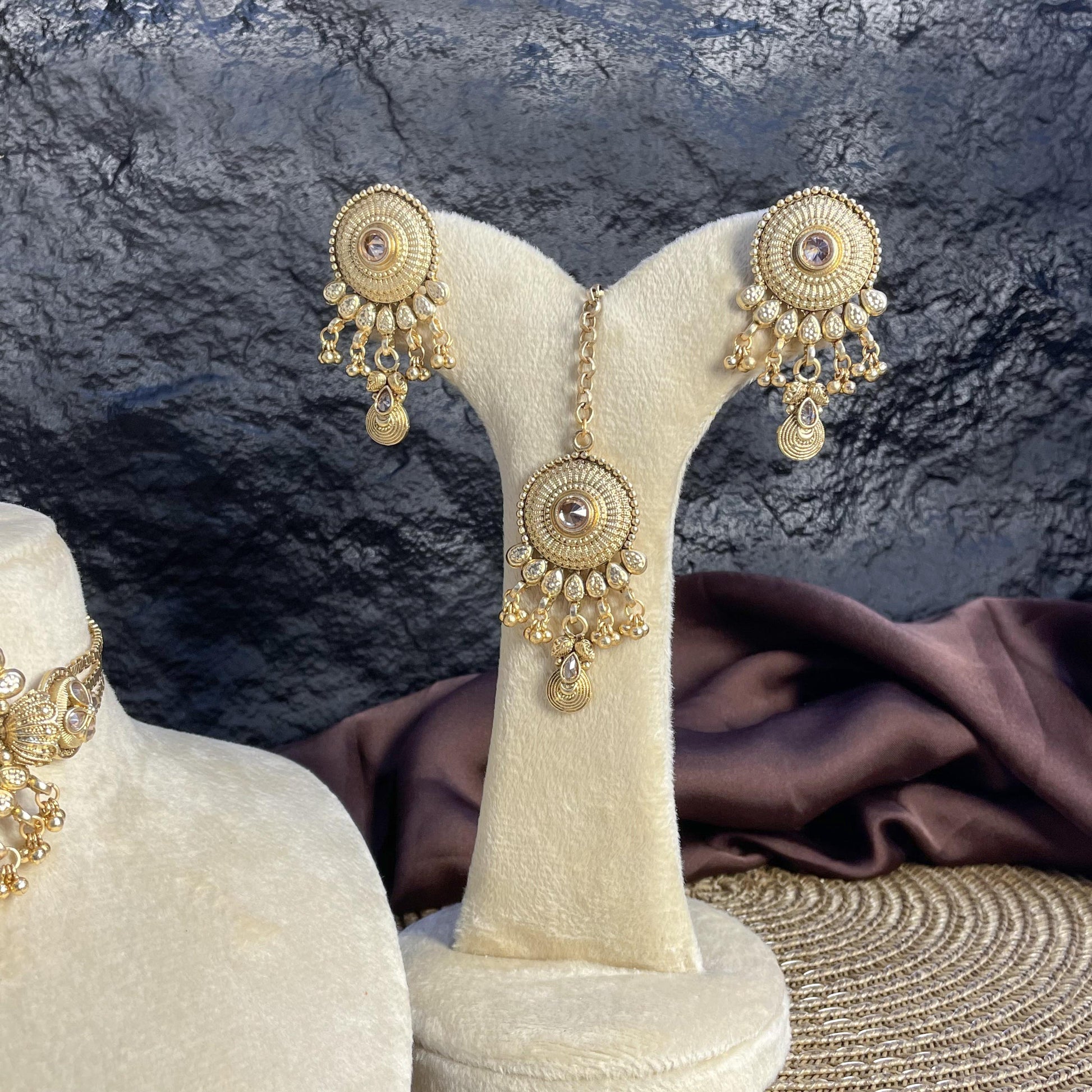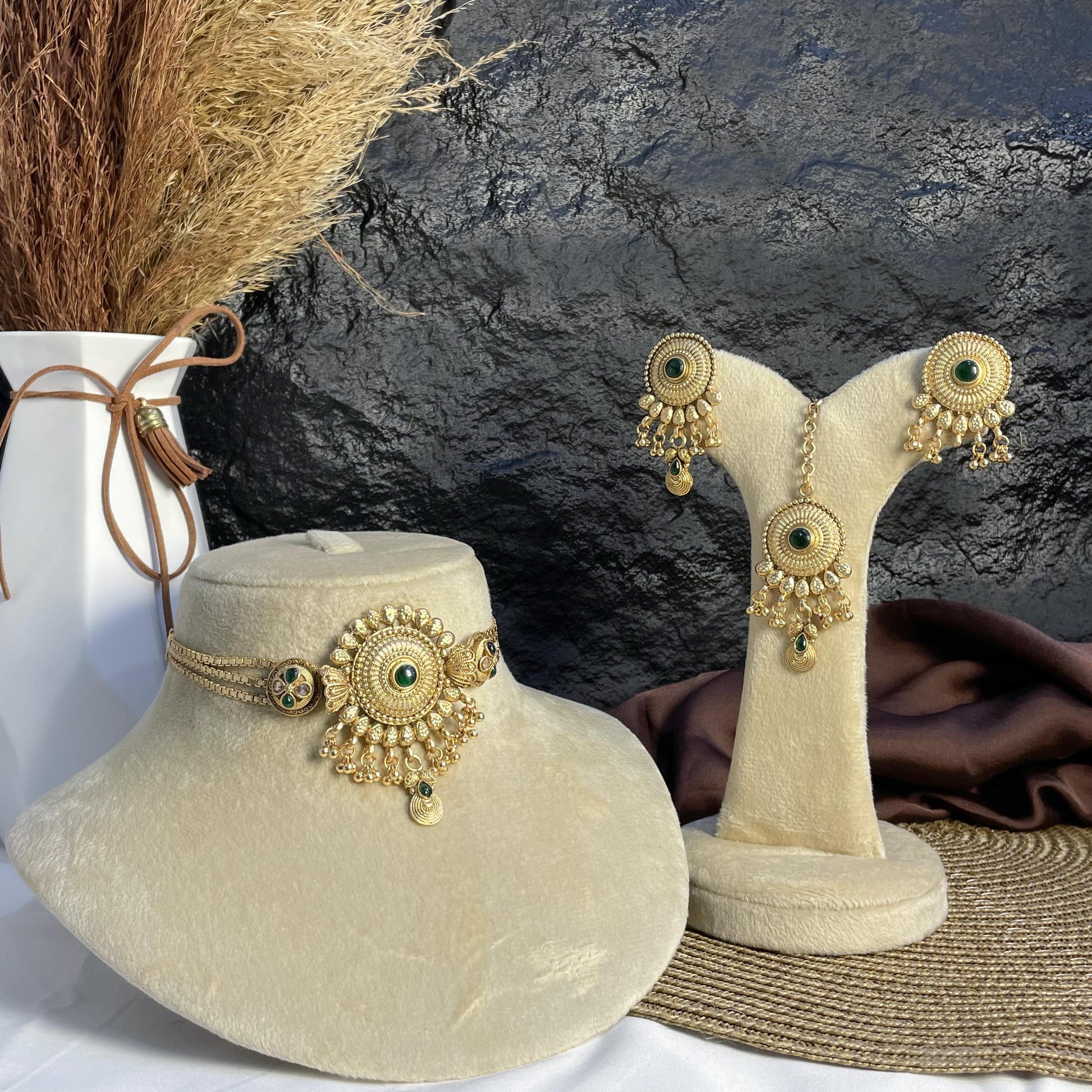 Features a regal circular mandala motif with golden textured patterns, embellished with plastic Kundan and vibrant glass stones.