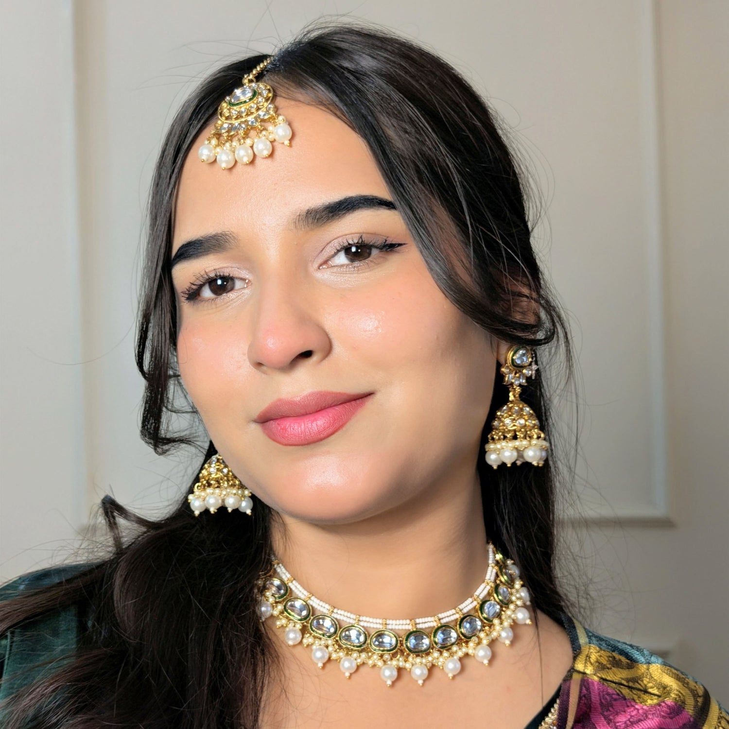 Wide matte golden finish choker detailed with ruby-red glass stones and Polki. Utilizes floral and teardrop themes with fine Rajwari artistry.