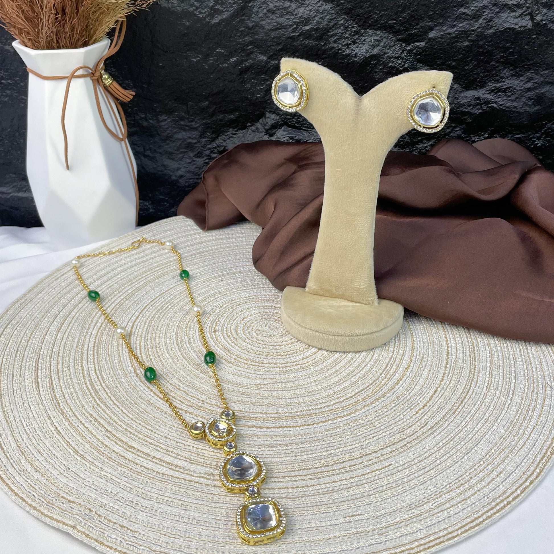 Featuring a unique linear pendant design with three graduating Kundan stones. The gold chain is punctuated with emerald-green glass beads and white pearls to create a nature-inspired aesthetic.